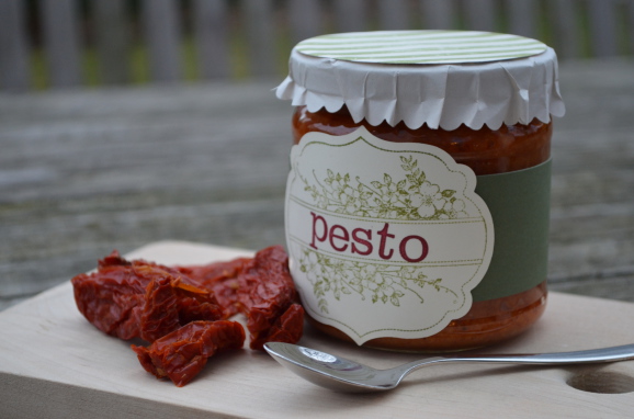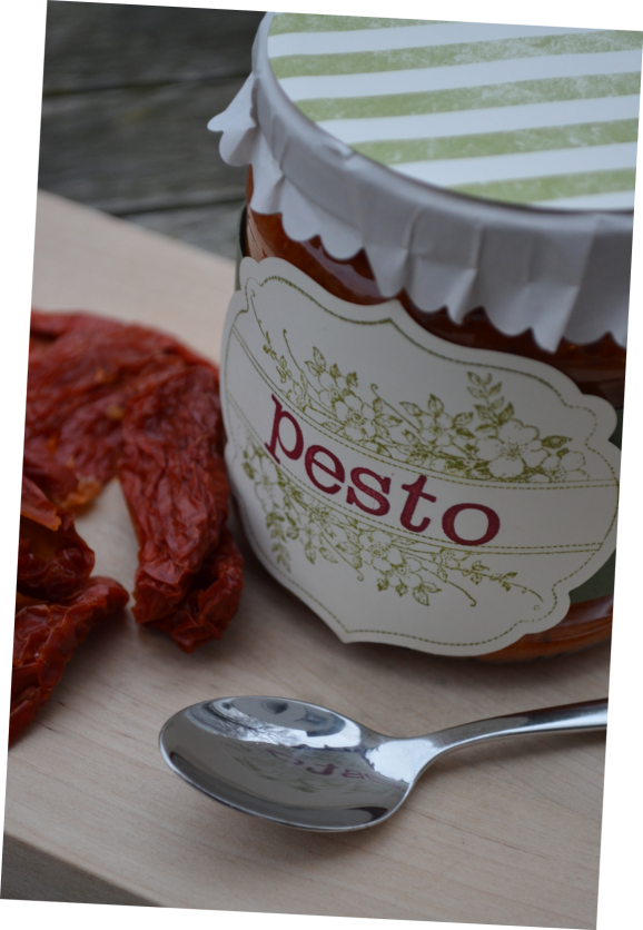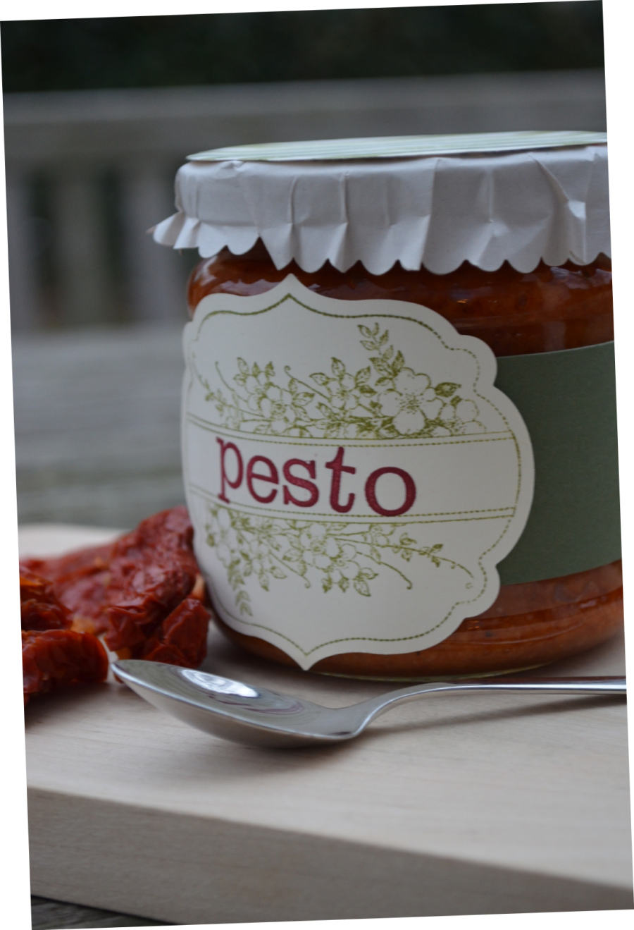 Hier hatte ich mit dem Thermomix Pesto selbst gemacht, anschliessend hübsch dekoriert und bei einer Einladung zum Essen verschenkt.