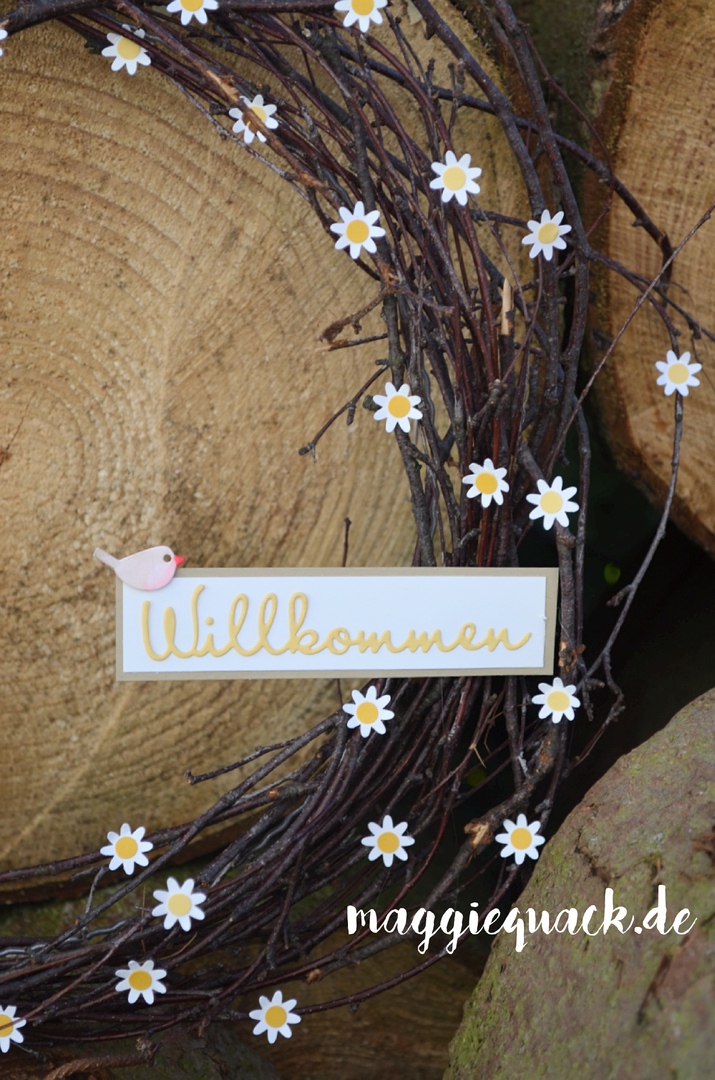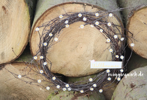Und wenn der Kranz fertig ist kann man ihn wunderbar mit kleinen Dingen aus Papier bekleben. Blätter, Blümchen, Sterne…. Was immer man möchte. Hier am Beispiel sind es ganz kleine Gänseblümchen mit einem Schild Willkommen. Sowas hält ewig und macht sich als Deko im Fenster oder auch am Schrank oder als Geschenk sehr gut. Falls jetzt die Frage nach Kleber kommt - einfach ein Punkt Heisskleber nutzen. Hübsch und einfach!