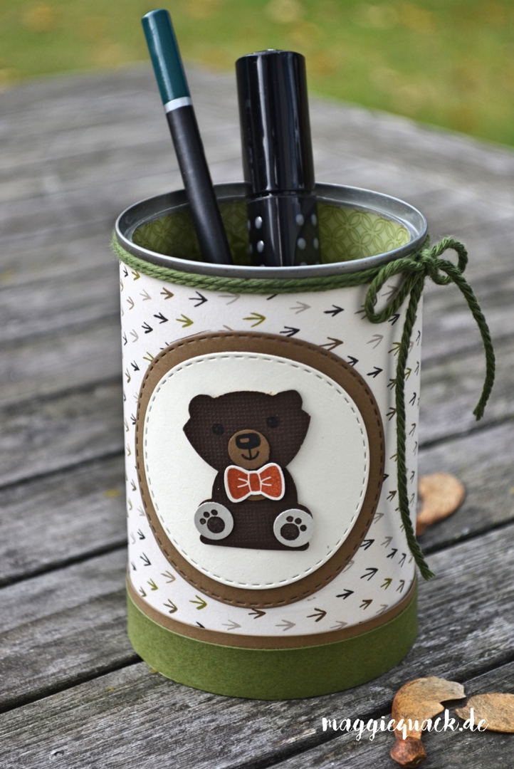 Mit solchen Kleinigkeiten kann man Kindern eine grosse Freude machen. Einfach eine leere gespülte Dose hübsch gestalten. Perfekt für den Schreibtisch, aber auch für den Bastel- oder Wickeltisch. Je nach Grösse und Form passen auch Cremes, Fieberthermometer sowie Bürste, Haarspangen oder Häkelsachen hinein.