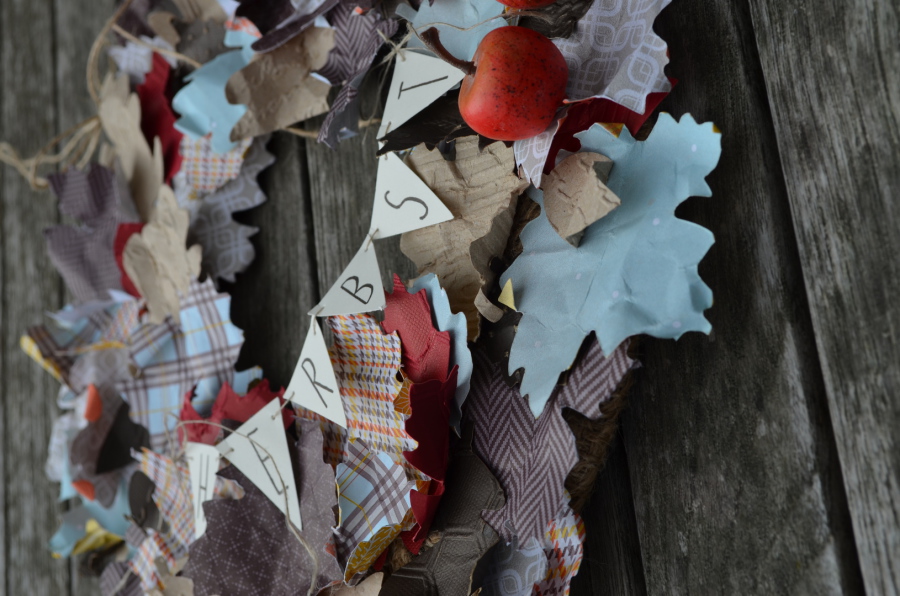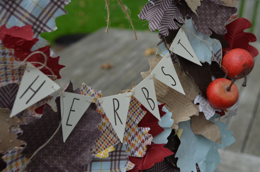 Für Kränze bin ich immer zu haben. Besonders Herbstkränze finde ich schön! Hier sind aus einem Satz DSP ganz schön viele tolle bunte Blätter gestanzt und dann geknuddelt verarbeitet worden. Noch kleine künstliche Äpfelchen und eine Mini-Girlande mit Herbst runden das ganze ab.